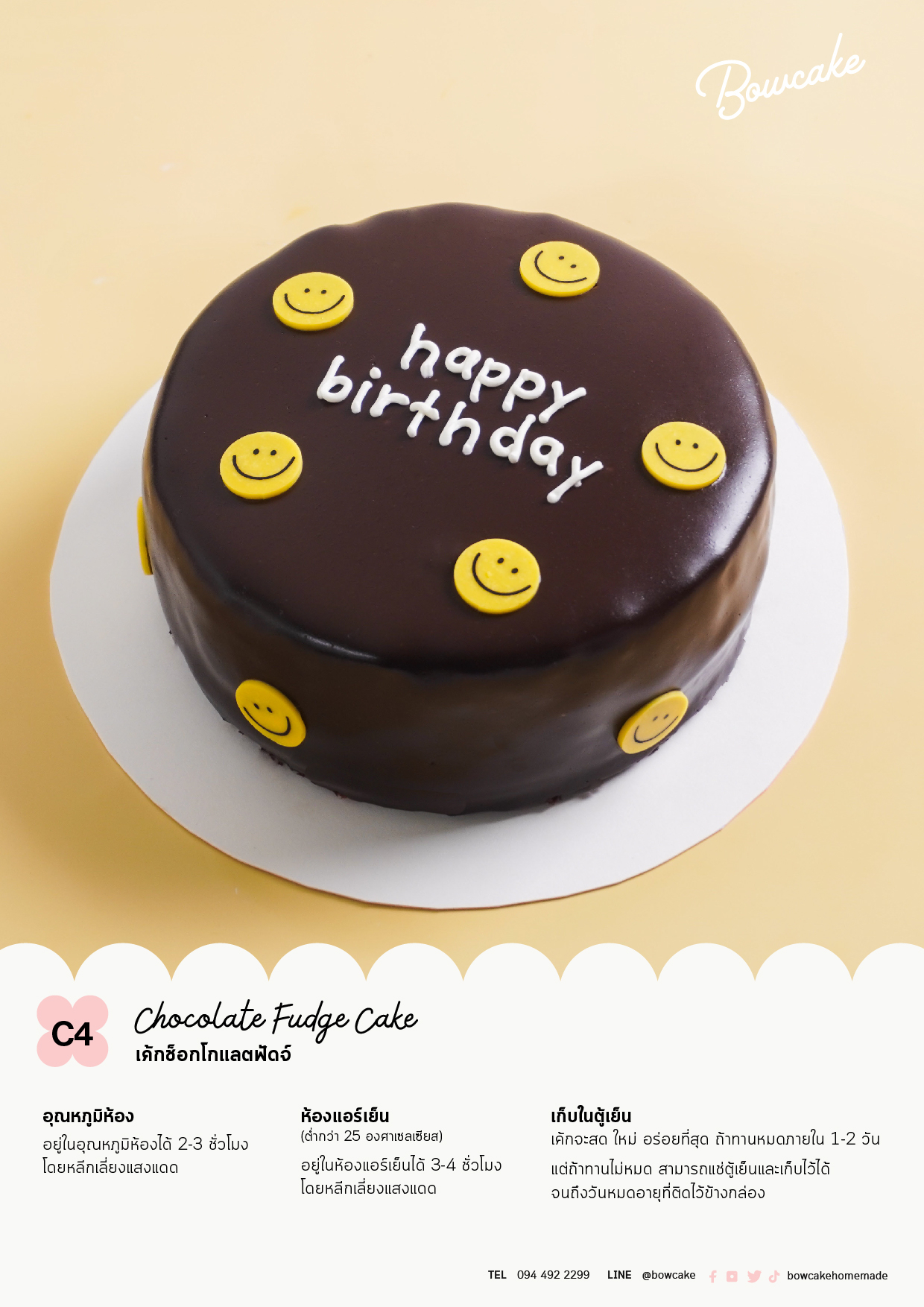 - เค้กอยู่ในห้องแอร์(ต่ำกว่า 25 องศาเซลเซียส) ได้ 2 ชั่วโมง โดยหลีกเลี่ยงแสงแดด หากเกินกว่านี้กรุณาเก็บรักษาในตู้เย็นช่องธรรมดา